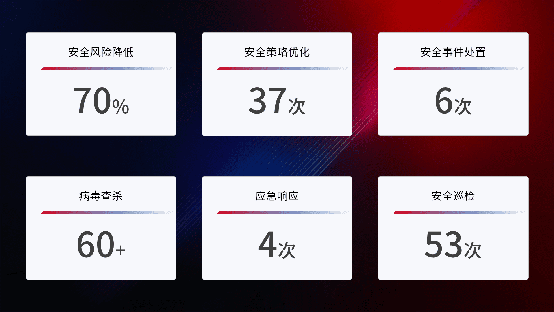 提供全面的安全事件报告体系,,包括处置报告、、周报、、、、季度和年度总结,,,结合持续监控,,,,帮助客户深入了解网络安全状况。。。
